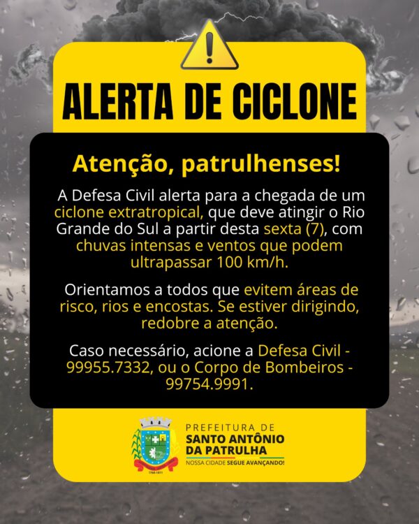 Defesa Civil e Prefeitura de Santo Antônio emitem alerta Em virtude da previsão de mais um ciclone extratropical que deverá atingir o Estado, especialmente a partir de amanhã, a Defesa Civil de Santo Antônio da Patrulha está emitindo o seguinte comunicado no sentido de alertar a população:Atenção, patrulhenses!A Defesa Civil alerta para os intensos ventos […]