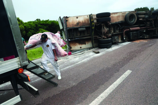 Um caminhão baú com um carregamento de carnes e que trafegava no sentido Capital-Litoral tombou no km 23 da freeway, em Santo Antônio da Patrulha, bloqueando temporariamente duas faixas daquela rodovia, para o transbordo da carga de carne bovina e que estava sendo destinada à estabelecimentos comerciais do litoral.Não houve feridos.