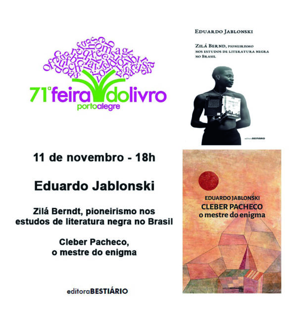O crítico literário Eduardo Jablonski, 56, lançou o seu 36º livro na Feira de Porto Alegre, nesta terça-feira, 11 de novembro, às 18h, na praça de autógrafos. Chama-se “Zilá Bernd, pioneirismo nos estudos de literatura negra no Brasil” (Editora Bestiário).