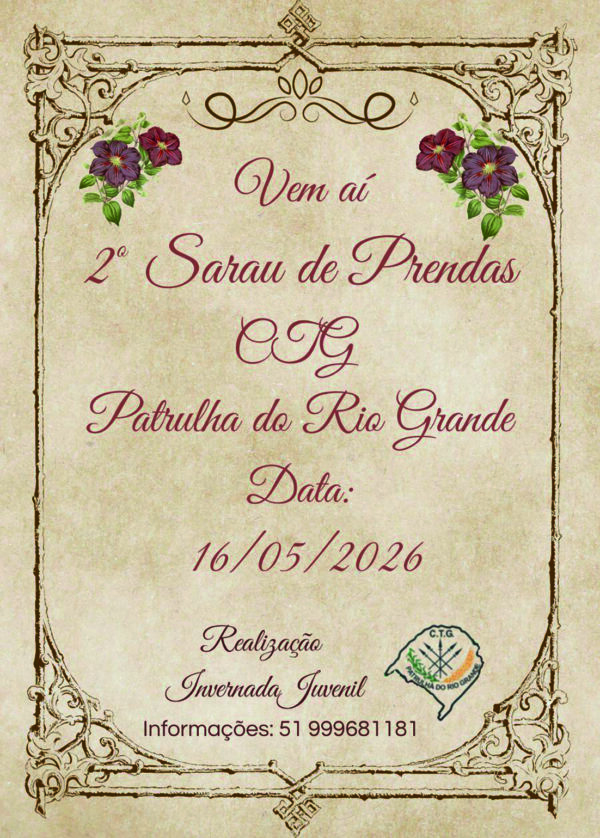 O tradicionalismo gaúcho volta a ganhar destaque em Santo Antônio da Patrulha com a realização do 2º Sarau de Prendas do CTG Patrulha do Rio Grande, marcado para o dia 16 de maio de 2026. O evento, que não era realizado no município há mais de dez anos, marca um importante resgate cultural e tradicionalista na cidade.