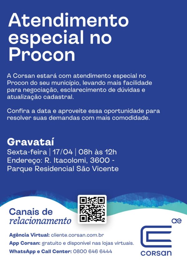 A Corsan estará prestando serviço especializado, na sexta-feira, 17, no Procon de Gravataí. A iniciativa tem como objetivo aproximar a Companhia da população, oferecendo atendimento presencial para esclarecimento de dúvidas e encaminhamento de demandas.