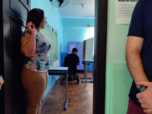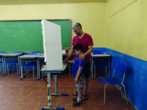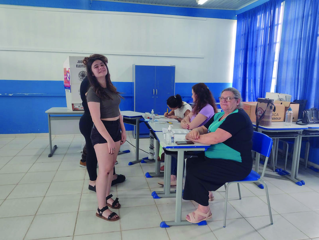 Na Escola Estadual Cândido de Barros, em Vila Palmeira, dona Guilhermina Barth, de 91 anos, utilizando um andador e amparada por seu neto, foi votar.